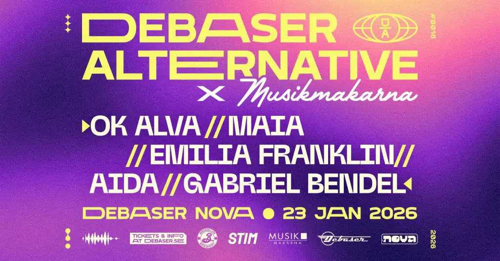 Debaser Alternative x Musikmakarna x STIMwww.debaser.se/events/debaser-alternative-x-musikmakarna-x-stimDörrar 18.00 Emilia Franklin 18.45 Maia 19.20 OK Alva 19.55 Aida 20.30 Gaberiel Bendel 21.05. Dörrar 18.00 Emilia Franklin 18.45 Maia 19.20 OK Alva 19.55 Aida 20.30 Gaberiel Bendel 21.05. Debaser Nova. 20 år (18 år med förköpsbiljett). 50 kr.…